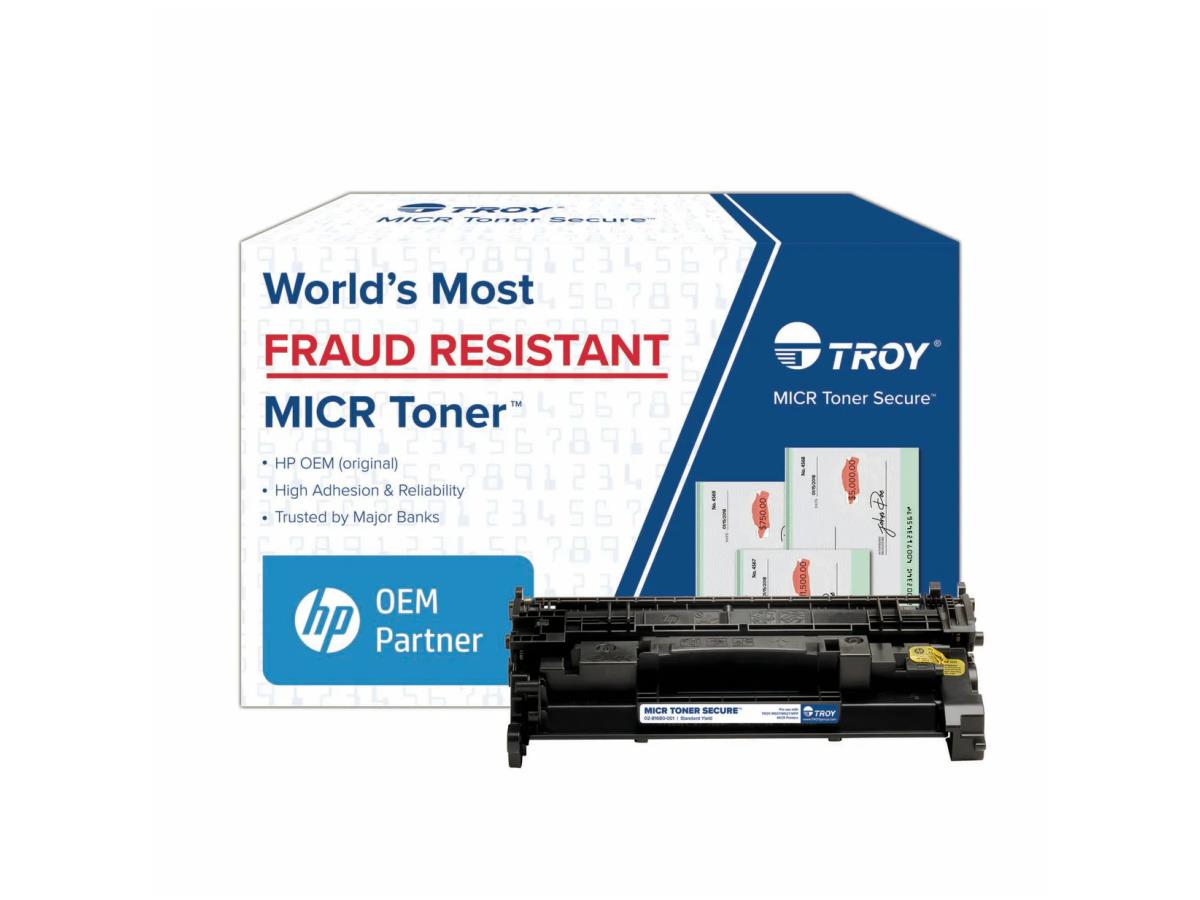 Features | Patented Anti-Tamper Security: Prevent check fraud by utilizing an extra layer of security to your printed checks. TROY?s MICR Toner Secure releases a red dye whenever chemical alteration is attempted, voiding the check. Precision-Matched: TROYs unique manufacturing and testing process has produced a precision-matched toner for each specific printing machine. This helps maintain optimum laser printer performance. Prevent Toner Scraping: Toner scraping attempts are commonly used to commit check fraud. Because of the high adhesion of our toner, this type of fraud is nearly impossible to commit. MICR Readability: Printed checks using TROY toner result in high readability and legibility that not only meets but exceeds all ANSI and ABA banking standards. HP OEM: In 1993, TROY became authorized by HP to enhance HP Printers and consumables for use in secure check and document printing. TROY is now the only HP OEM partner authorized to modify HP printers and supplies for secure print applications. |