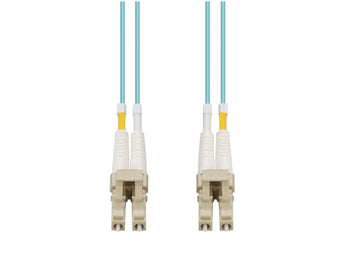 This is a 30m HP AJ838A Compatible LC (male) to LC (male) aqua duplex riser-rated fiber patch cable. An OM3 cable has a core size of 50 microns that supports 10 Gigabit Ethernet at lengths measuring up to 300 meters, and 40 Gigabit or 100 Gigabit Ethernet