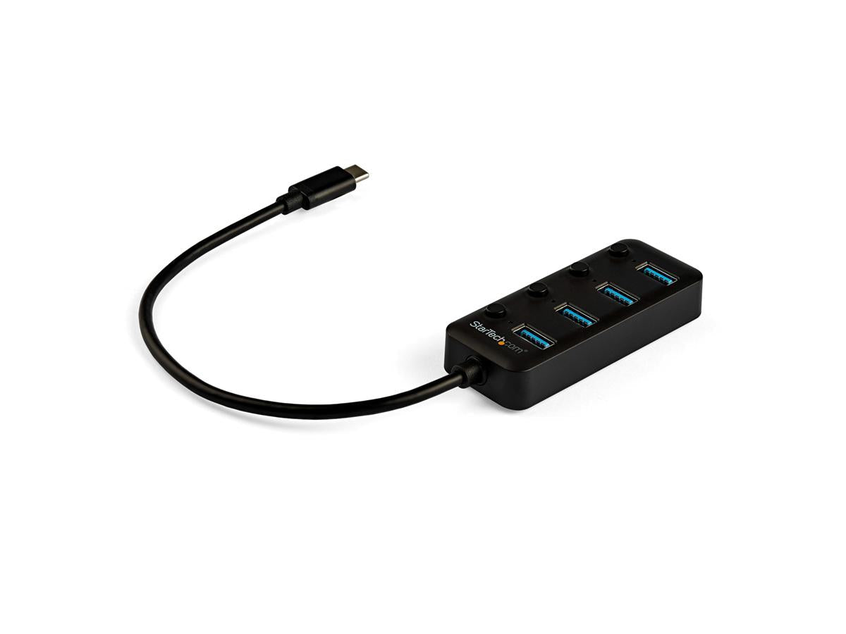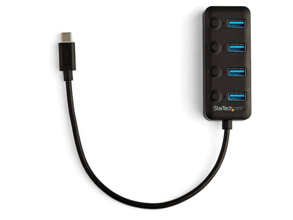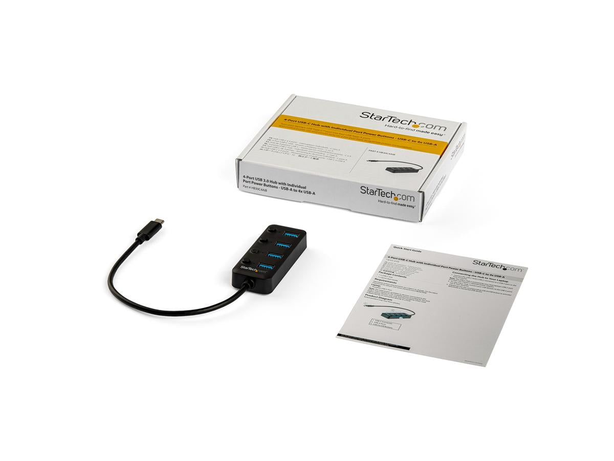 | Product Description | StarTech.com 4 Port USB C Hub, USB-C to 4x USB 3.0 Type-A Ports with Individual On/Off Port Switches, SuperSpeed 5Gbps USB 3.1/3.2 Gen 1, USB Bus Powered, Portable, 10" Attached Cable - Windows/macOS/Linux (HB30C4AIB) - hub - 4 ports |