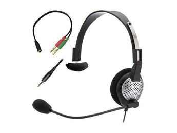 NC-181 On-Ear Monaural Computer Headset with noise-canceling microphone with a single 3.5mm 4-pin shared audio plug (TRRS) for use with devices with a shared audio port including tablets, laptops, and smartphones. Includes Y adapter for computers with dual audio jacks.