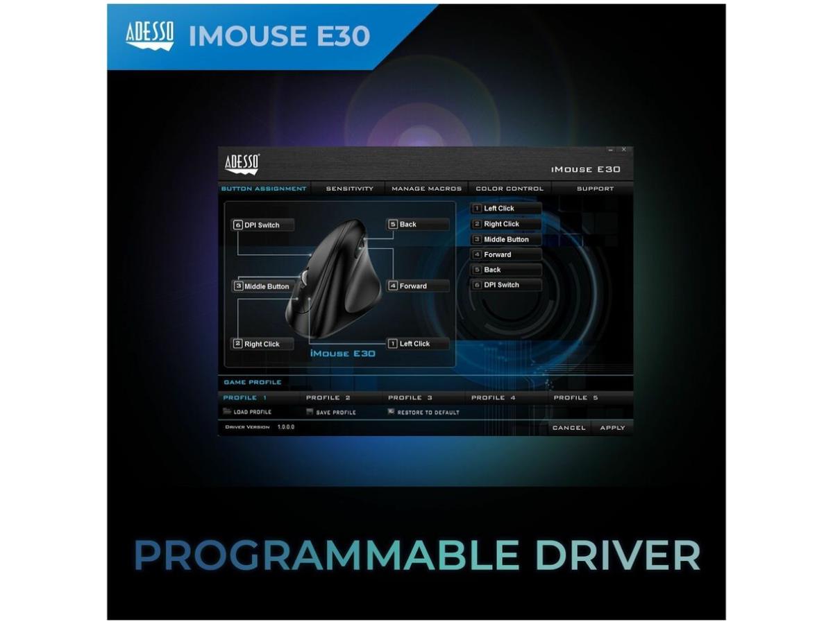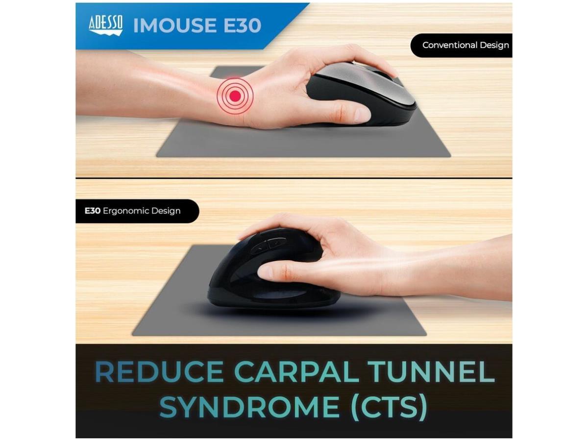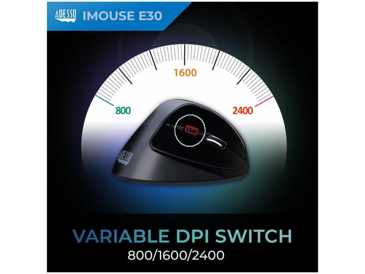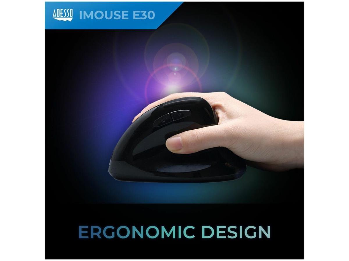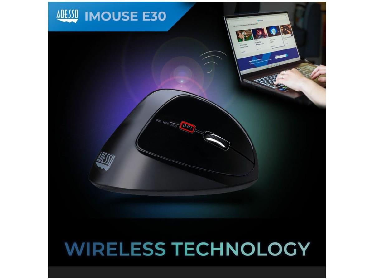 iMouse E30- Adesso 2.4 GHz Wireless Vertical Righthanded Mouse, 2.4 GHz wireless USB Vertical design, right-handed. DPI 800/1200/1600 (or 400-4800 with driver).