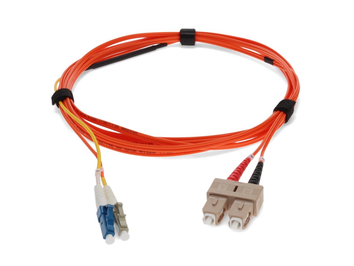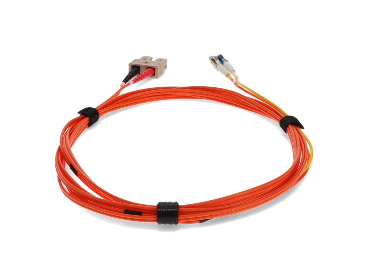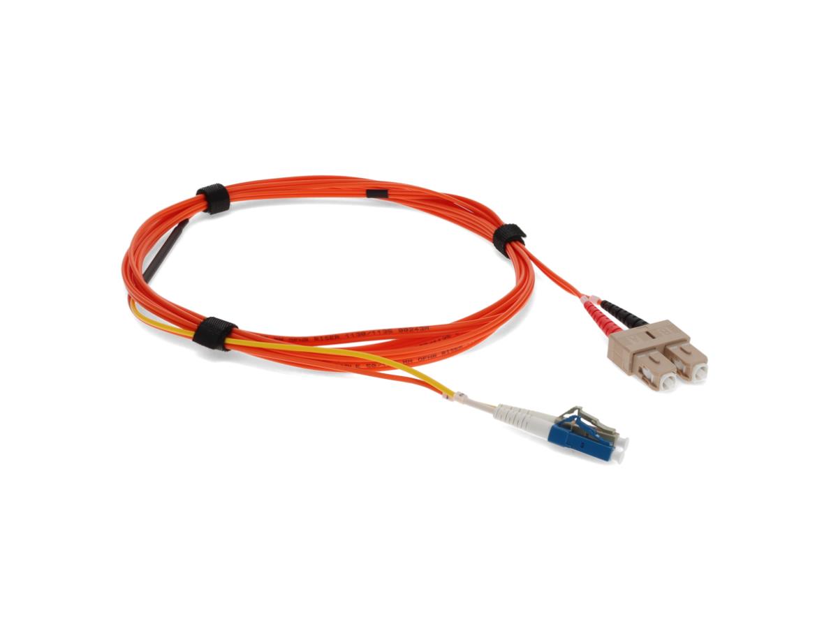 This is a 3m LC (male) to SC (male) orange duplex riser-rated fiber mode conditioning cable. OM2 & OS1 eliminates differential mode delay signals by aligning the single-mode launch away from the center of a multimode fiber core. This creates a transmitted