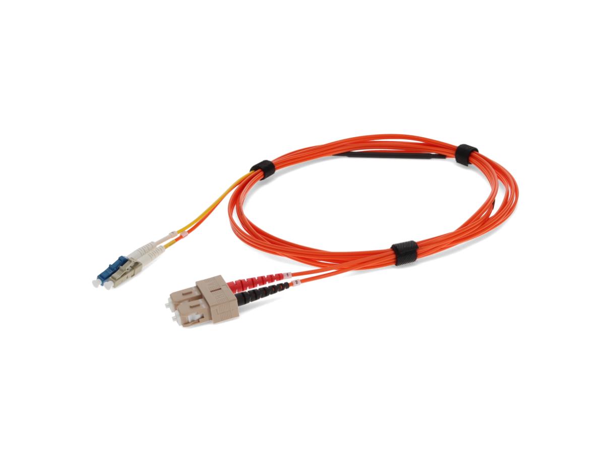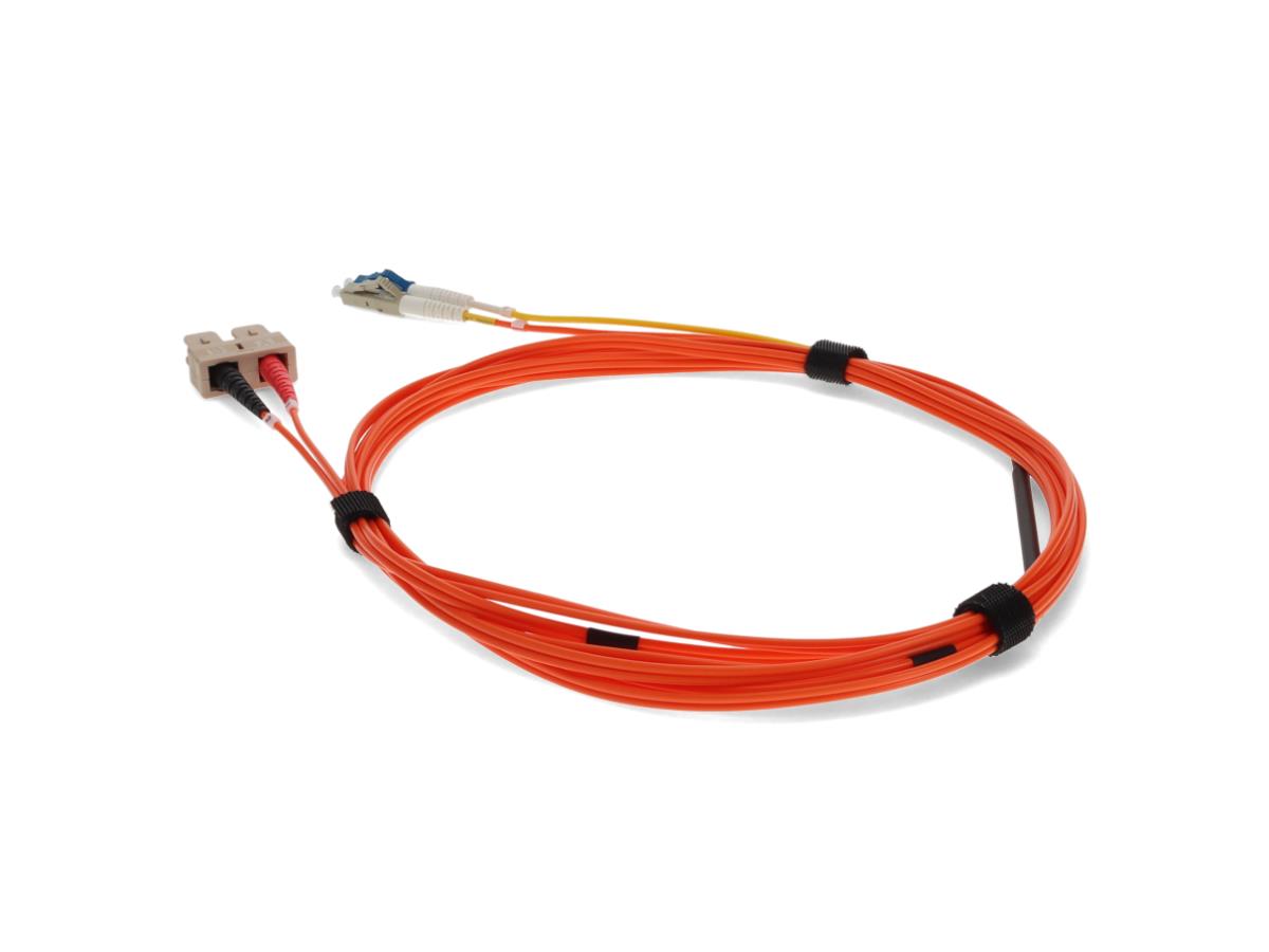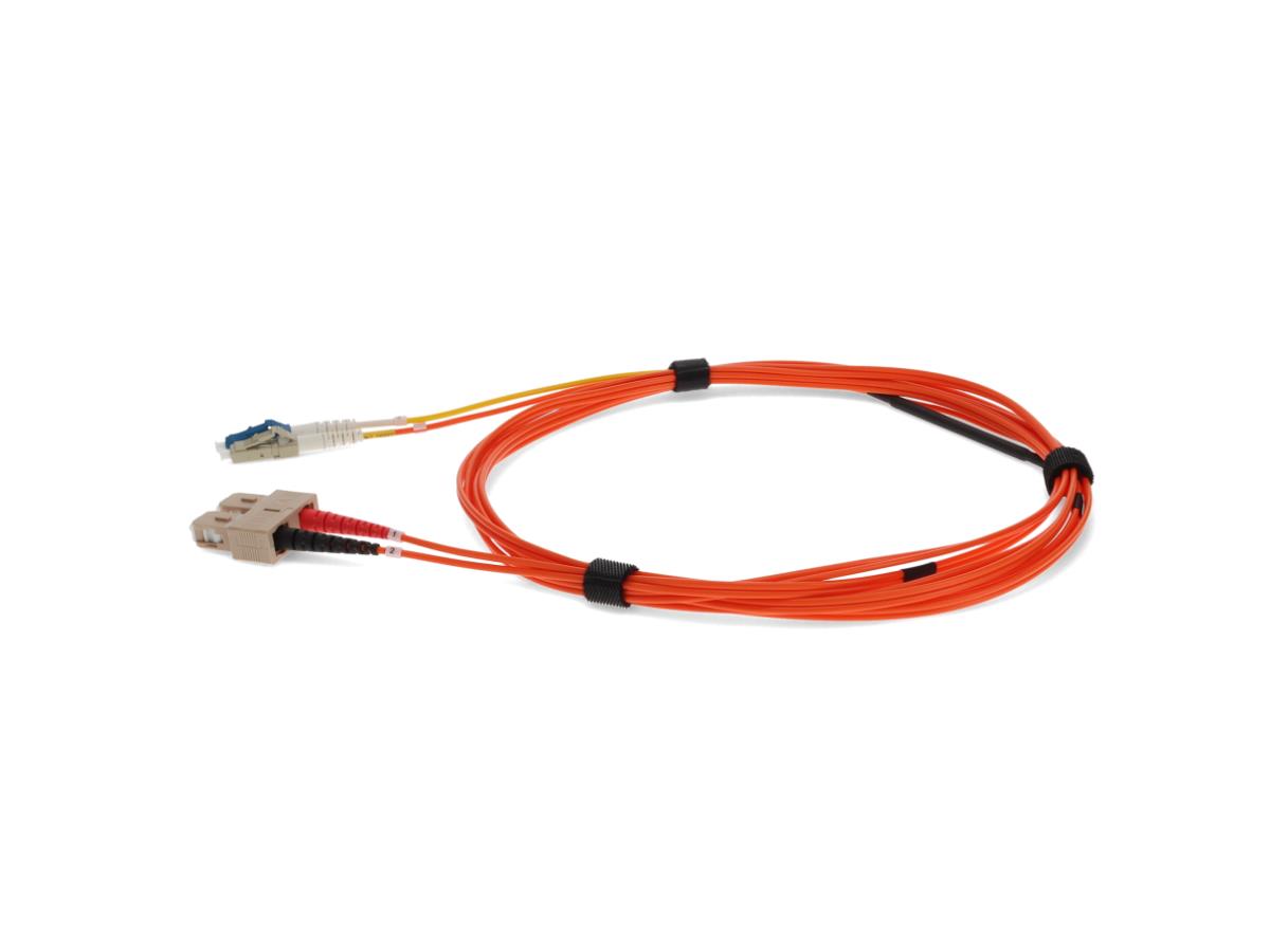 This is a 3m LC (male) to SC (male) orange duplex riser-rated fiber mode conditioning cable. OM2 & OS1 eliminates differential mode delay signals by aligning the single-mode launch away from the center of a multimode fiber core. This creates a transmitted
