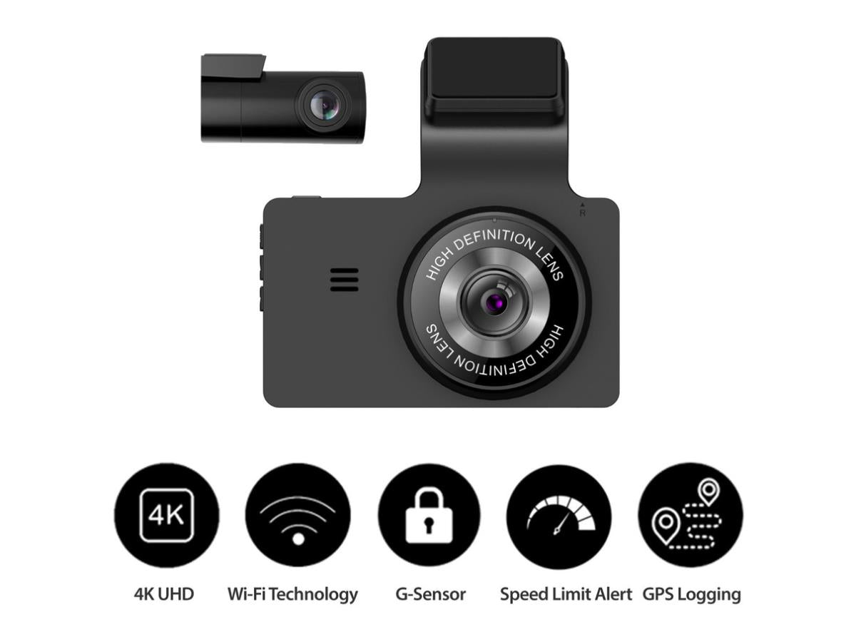 Features | 4K (Front) 1080p (Rear), Wi-Fi for Instant File Sharing, GPS Logging, Time Lapse Recording, Speed Reminder, Driver Fatigue Alert, Supports up to 128GB, 32GB MicroSD Included, G-Sensor |