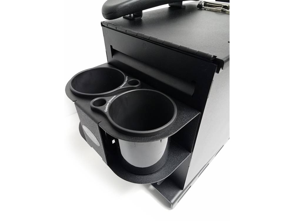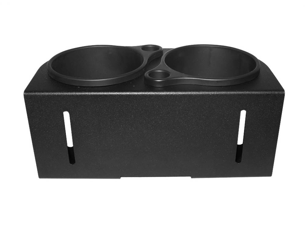 External Cup Holder - Metal,Steel - Black - Black powdercoat finish on metal bracket with opening for two individual cup inserts, Heavy gauge steel construction for long - term durability, Bracket mounts to console boxes or to top plate, Two black cup inserts with convenient pen holder, Inserts removable for cleaning, Cup depth is over 3.5 (8.89 cm), Cup opening diameter is 3.4 (8.64 cm)