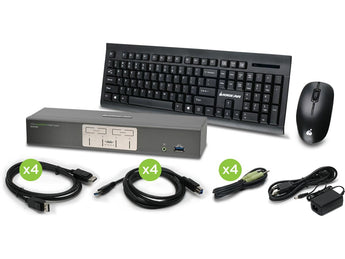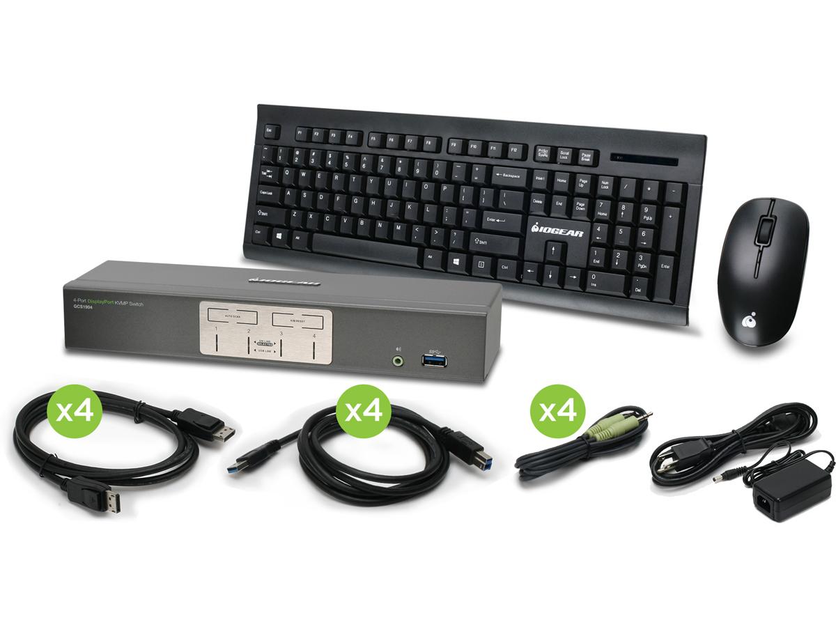 What's Included 1 x 4-Port 4K UHD DisplayPort 1.1 KVMP; 1 x Wireless Keyboard; 1 x Wireless Touch Sensor Mouse; 1 x USB RF Receiver; 4 x DisplayPort Cables (6ft.); 4 x USB 3.0 Cables (6ft.); 4 x Audio Cables (6ft.); 1 x Power Adapter; 1 x Manual