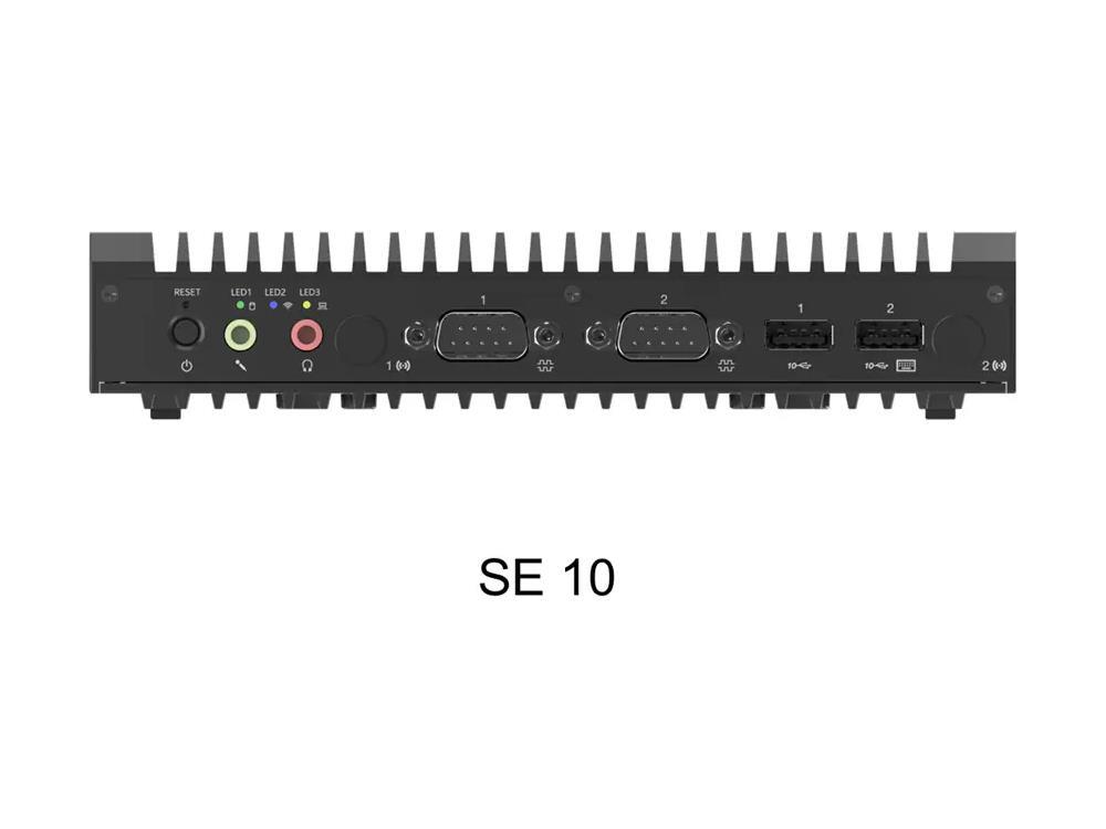 Interfaces & Connections | RJ-45, 2x USB 3.2 Gen 2, 1x line-out (3.5mm), 1x microphone (3.5mm), 3x LED (LED1: storage / LED2: Wireless / LED3: User defined or WWAN), 2x Serial (RS232 / RS422 / RS485, BIOS selectable), 1x HDMI 1.4b, 1x DisplayPort 1.4, 2x USB 2.0, 2x 2.5GbE Ethernet (RJ-45), 1x Slim Tip power connector (SE10 only), 1x DC-in 3pin Phoenix connector for 9-36V WDC (SE10-I only), 1x 2pin remote power switch (SE10-I only) |