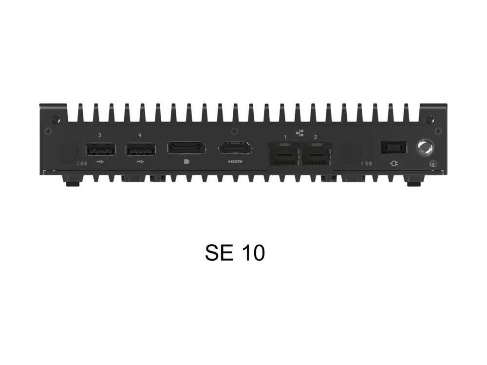 Rear I/O Ports | 1x HDMI 1.4b, 1x DisplayPort 1.4, 2x USB 2.0, 2x 2.5GbE Ethernet (RJ-45), 1x Slim Tip power connector (SE10 only), 1x DC-in 3pin Phoenix connector for 9-36V WDC (SE10-I only), 1x 2pin remote power switch (SE10-I only) |