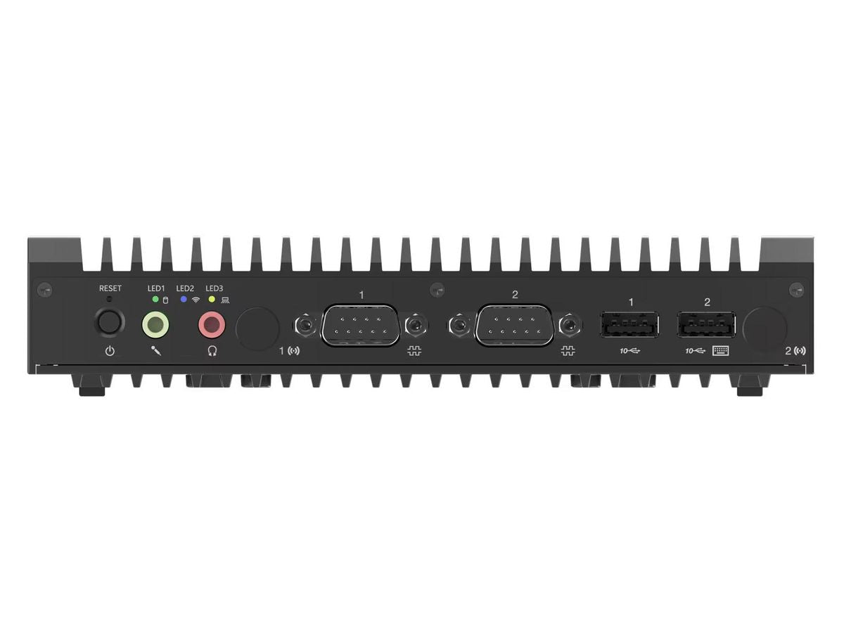 Front I/O Ports 2x USB 3.2 Gen 2, 1x line-out (3.5mm), 1x microphone (3.5mm), 2x serial (RS232 / RS422 / RS485, BIOS selectable), 3x LED (LED1: storage / LED2: Wireless / LED3: User defined or WWAN)