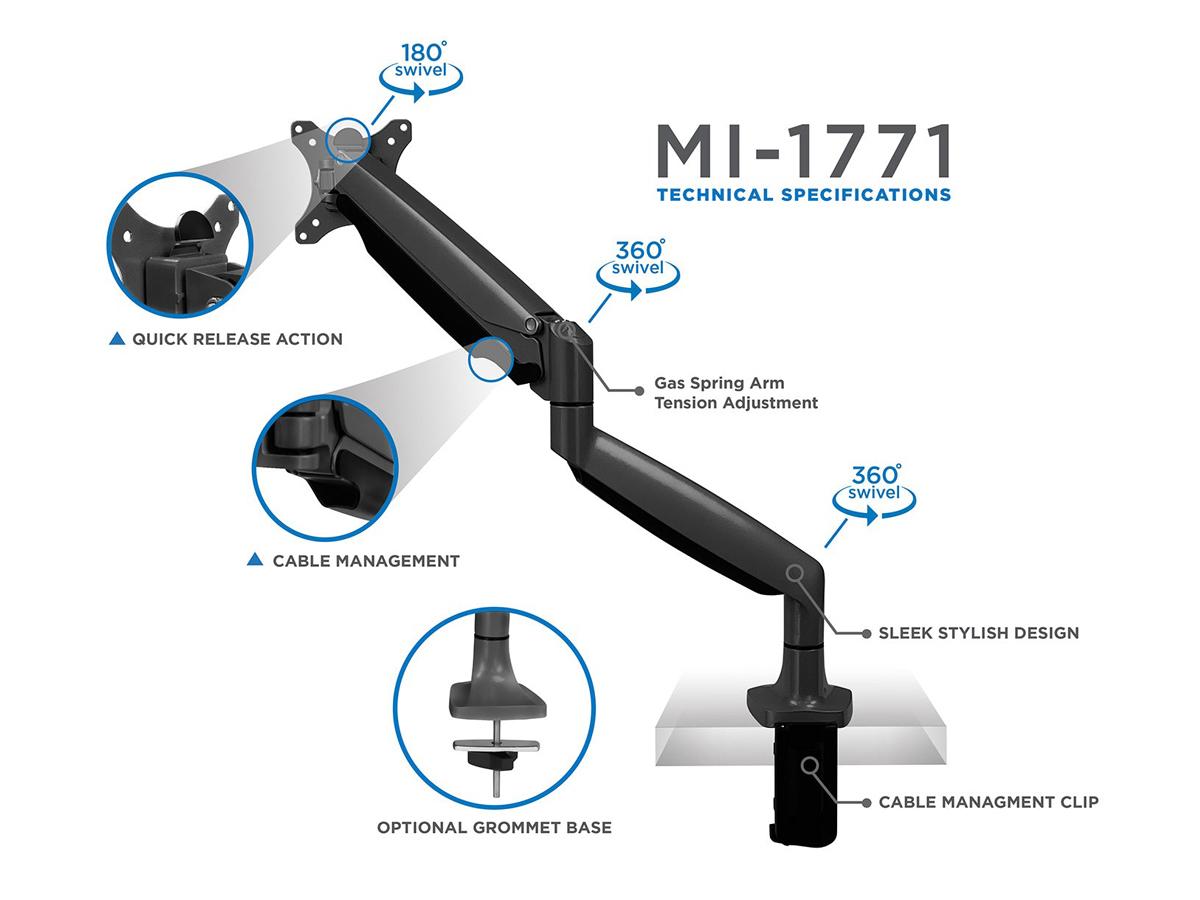 SINGLE monitor arm adjusts effortlessly for easy use. Full motion arms extend and retract, tilt, swivel and adjust in height. You can also rotate the monitors independently to switch between landscape and portrait modes.