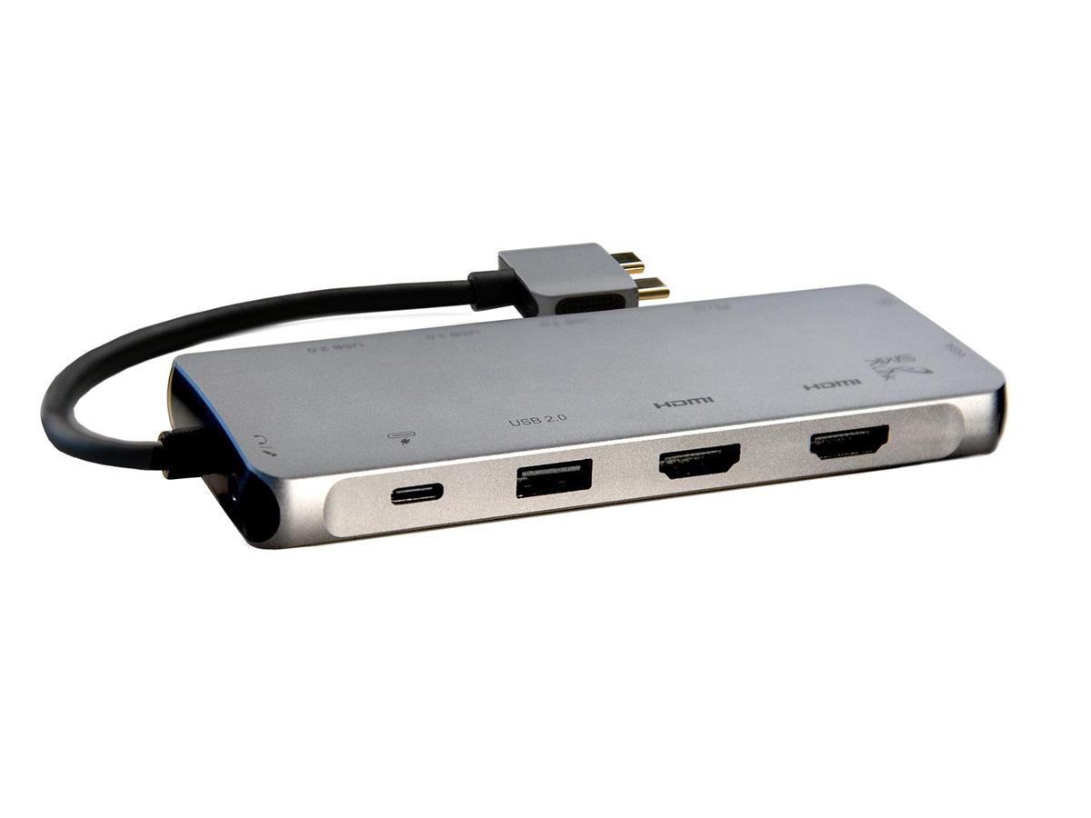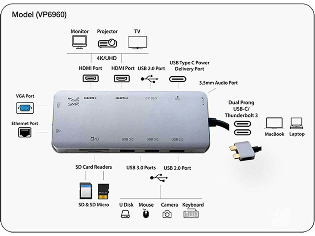 The 100W 12-port USB-C Dual 4K Multi-Stream Mini Docking Station provides true dual 4K independent external displays for your Mac and Windows laptops. The VP6960 offers 2 x 4K HDMI, VGA, GbE, 4 x USB-A, Audio, Mini/Micro SD reader all in a compact size.