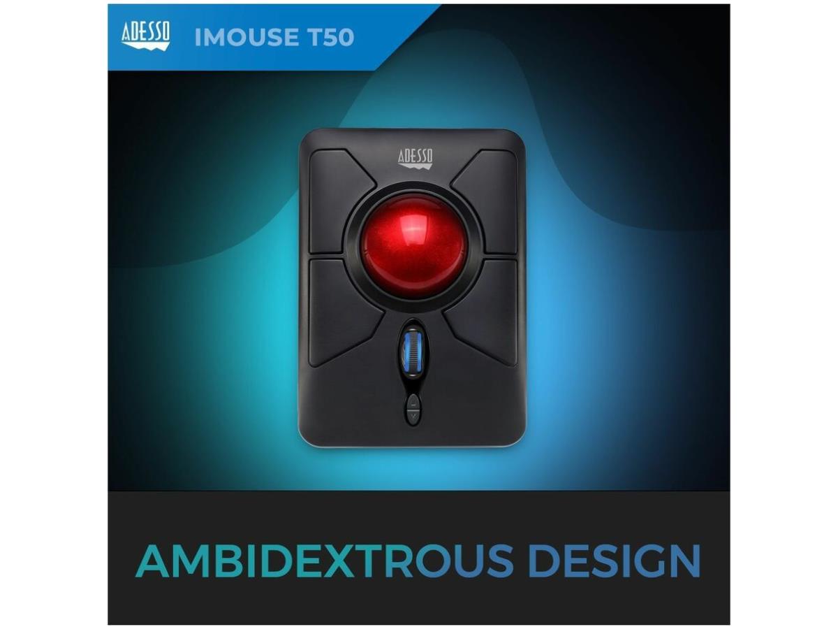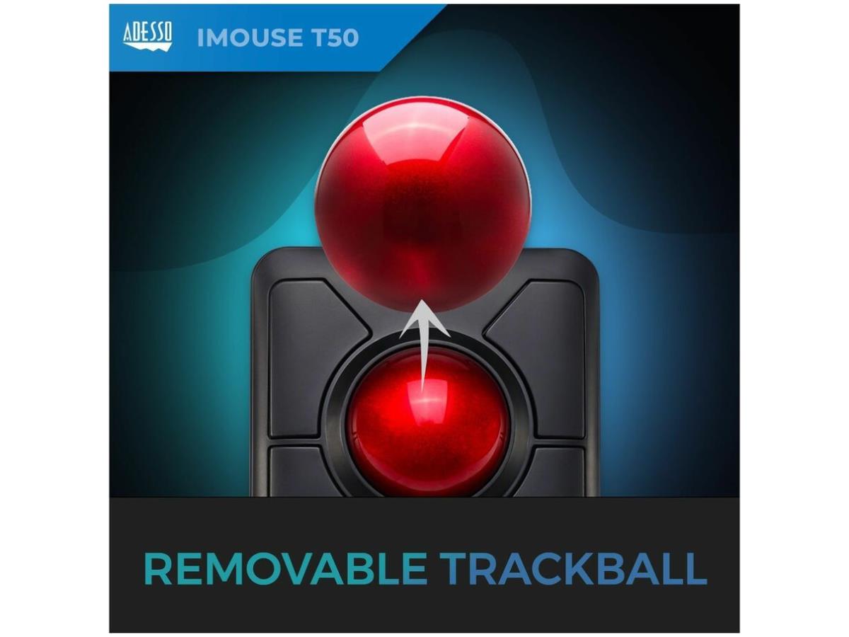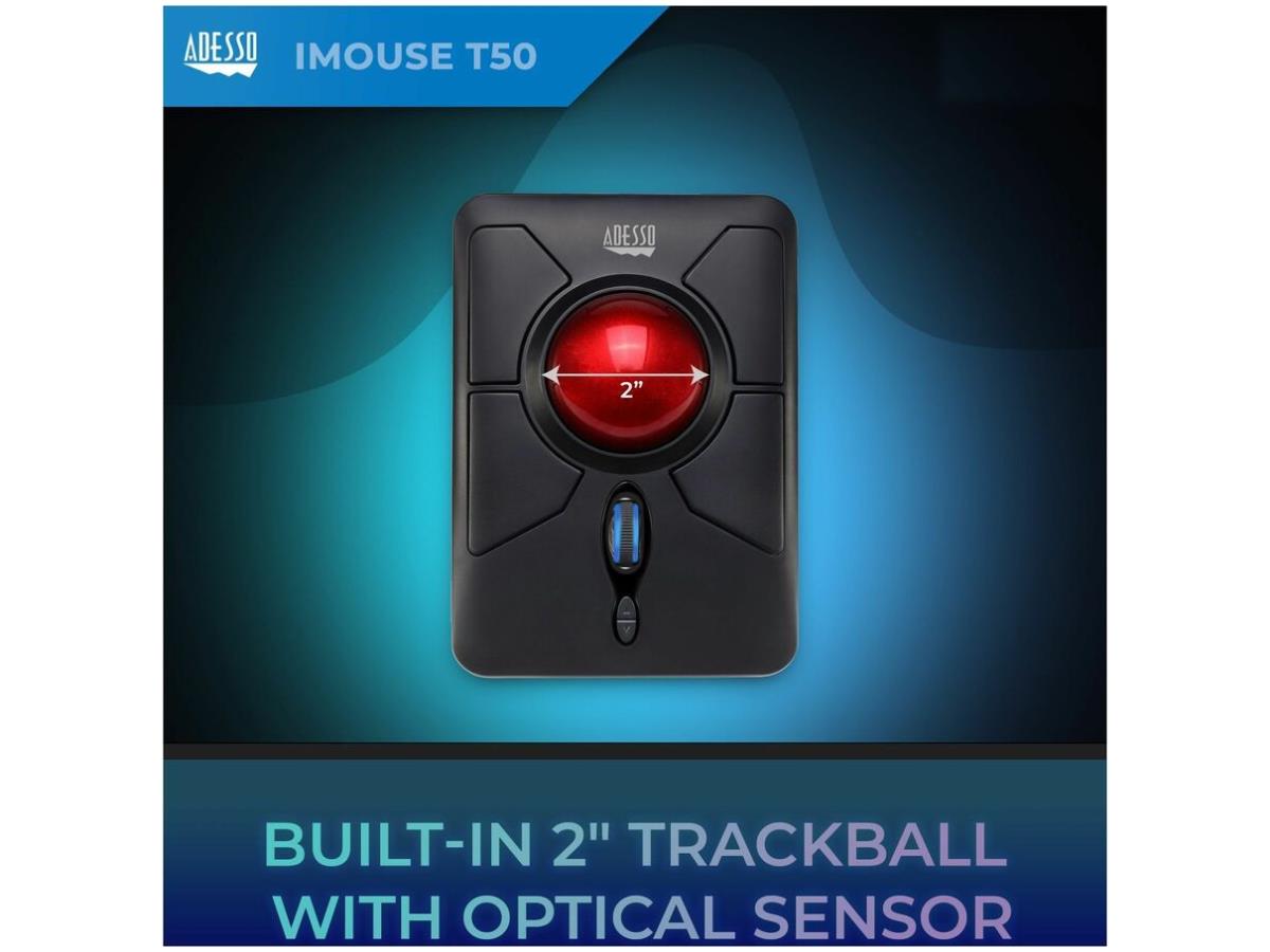 What's Included | Adesso iMouse T50 Wireless Programmable Ergonomic Trackball Mouse; USB Wireless Receiver; 2 AAA Batteries; Quick Start Guide |