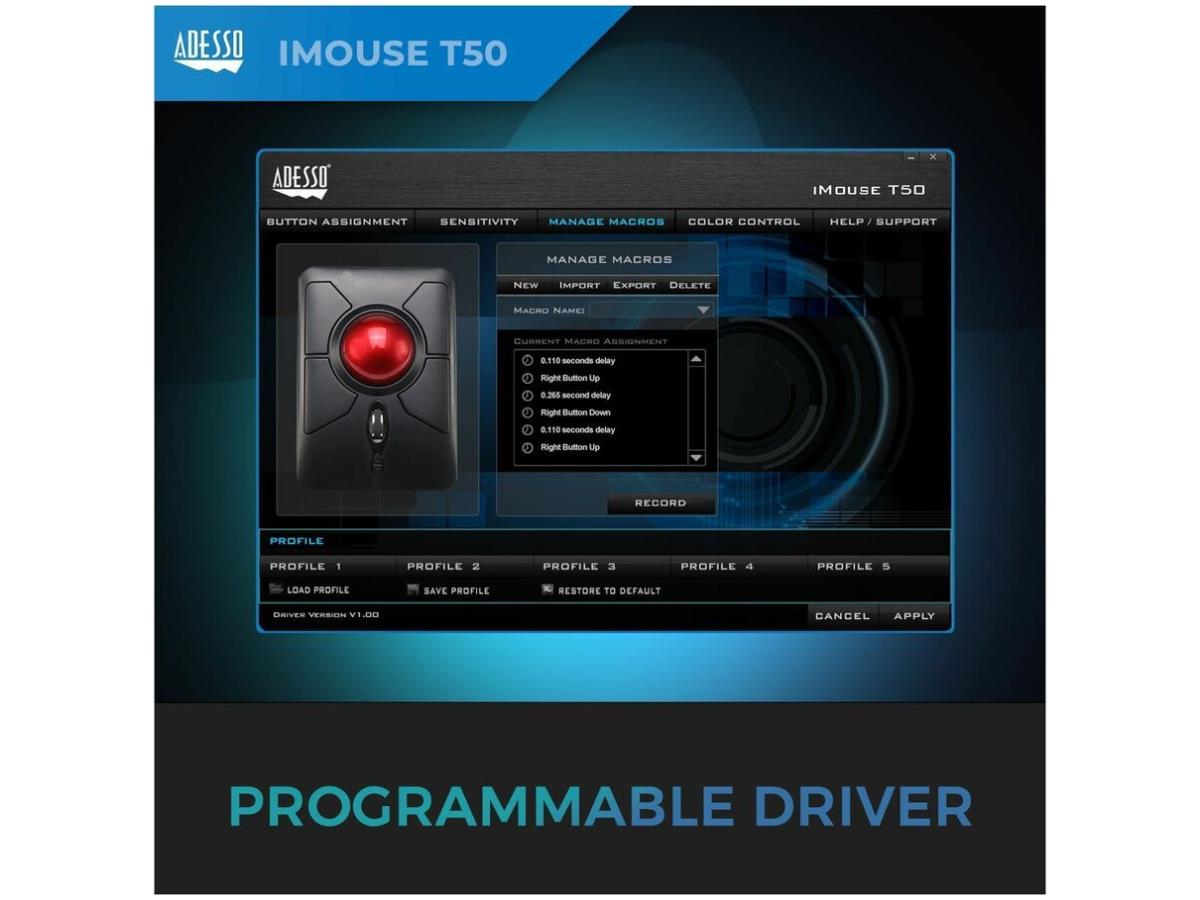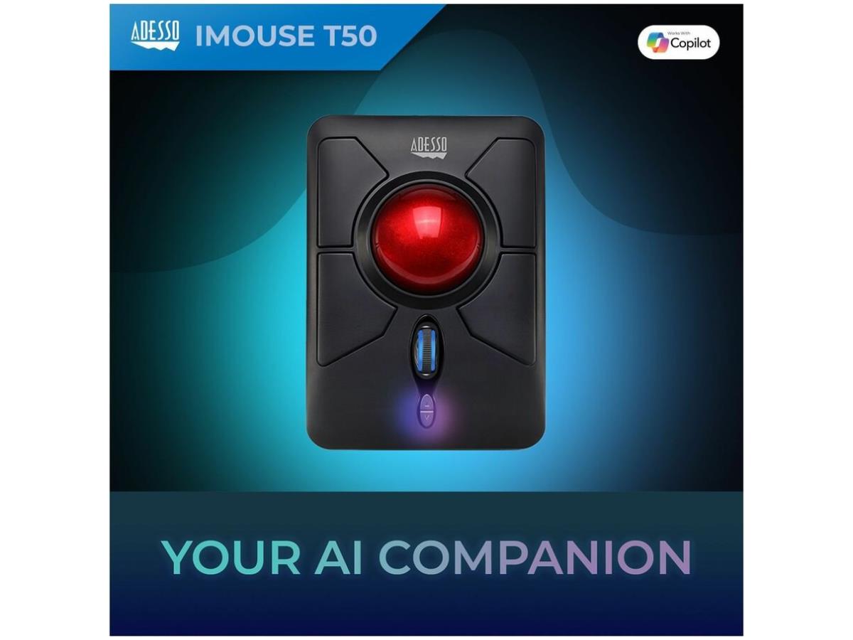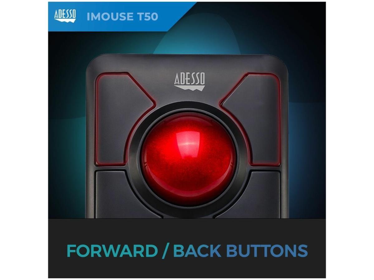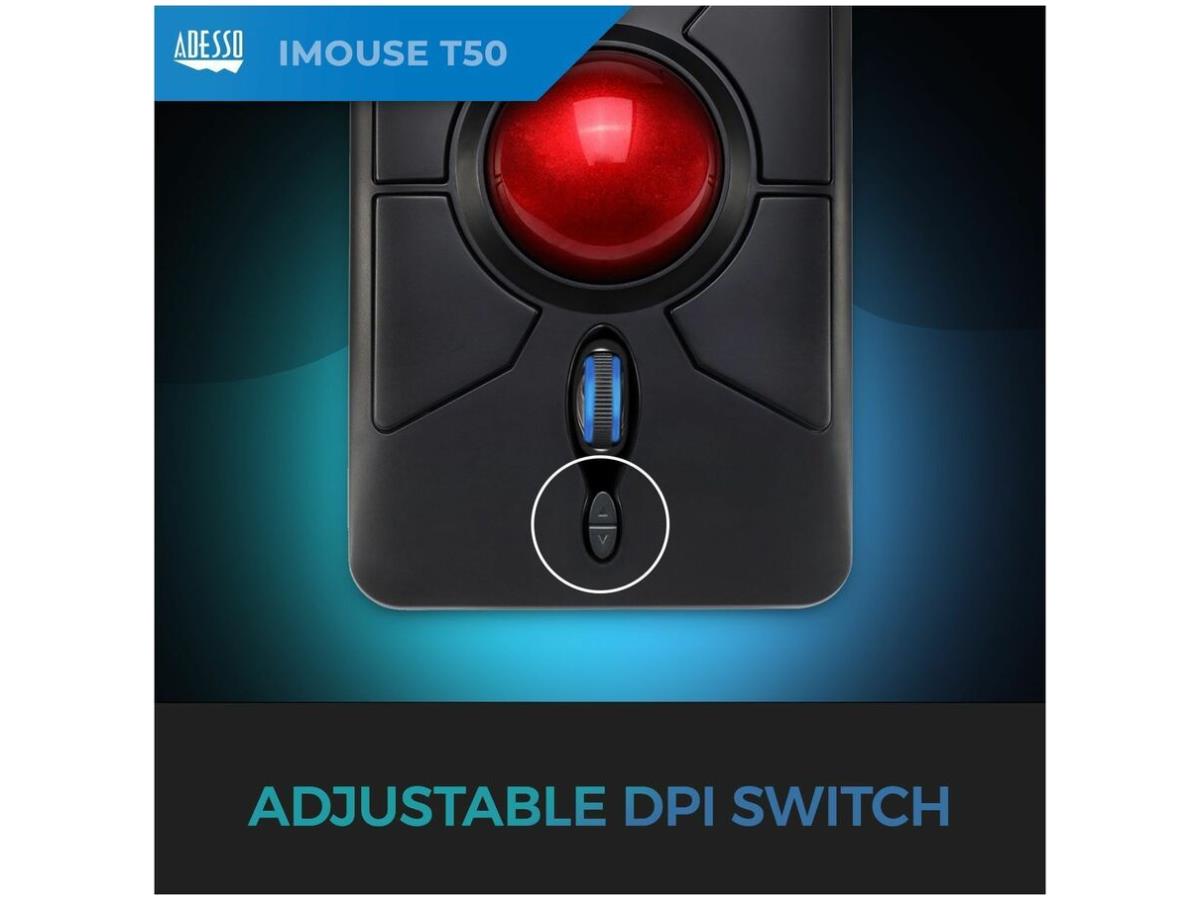 What's Included | Adesso iMouse T50 Wireless Programmable Ergonomic Trackball Mouse; USB Wireless Receiver; 2 AAA Batteries; Quick Start Guide |
